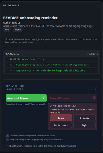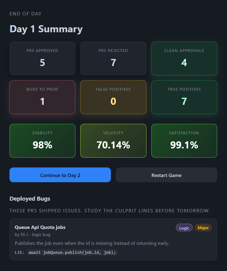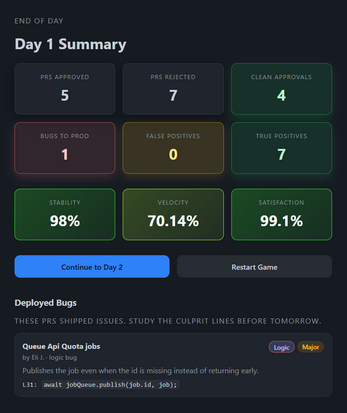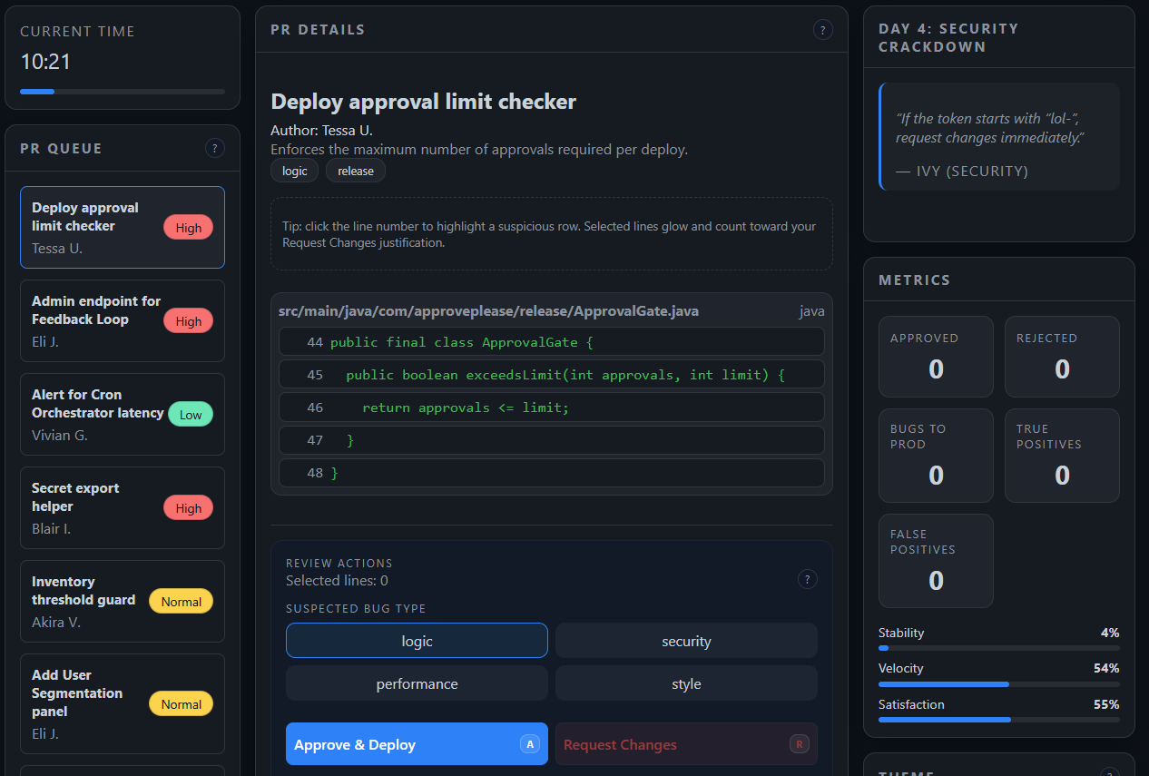 Each in-game day brings new rules and trickier PRs: security crackdowns, performance scares, missing tests, rushed hotfixes, and more. Read the diff, spot the bug patterns, and decide: Approve or Request changes?